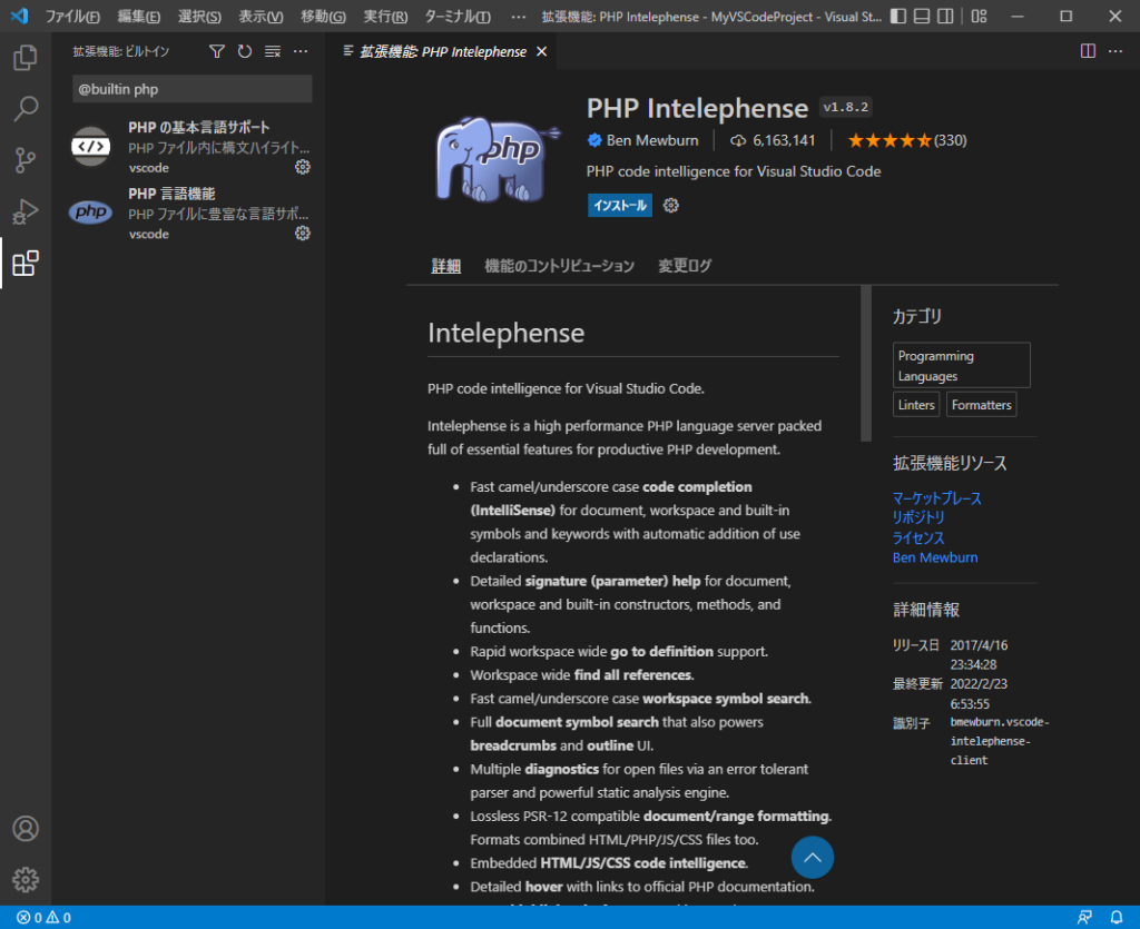 ドットインストールさんのおかげで、拡張機能が割と手軽だという事も分かったので、2つほど拡張機能を入れてみました。全角スペースを分かりやすく表示してくれる「zenkaku」とやらと、標準よりも強力なインテリセンスらしい「PHP Intelephense」です。
